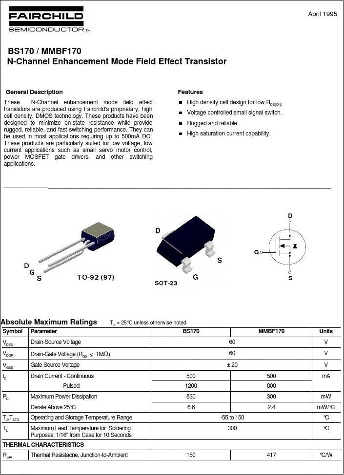 El BS170_D75Z es un mosfet diseñado para minimizar la resistencia y proporciona un rendimiento de conmutación robusto, confiable y rápido, pudiendo ser utilizado en la mayoría de las aplicaciones que requieren hasta 500 mA de CC. Este mosfet es adecuados para baja tensión en aplicaciones como control del servomotor, controladores de compuerta MOSFET de potencia y otras aplicaciones de conmutaciones.