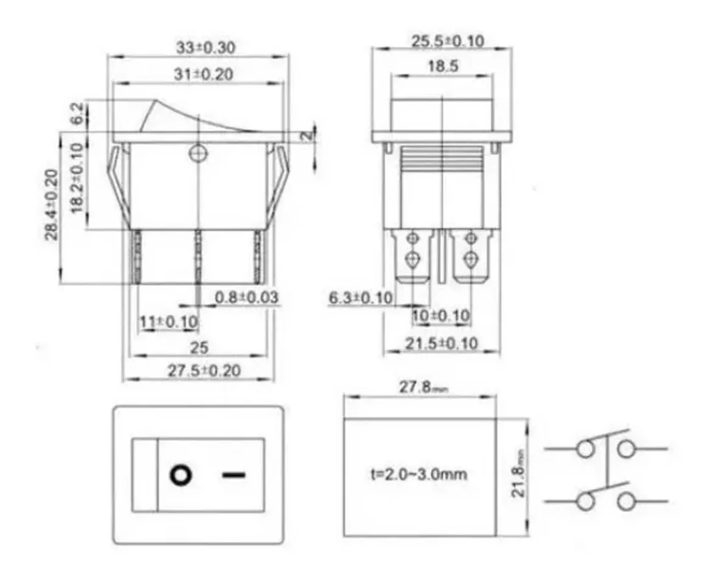 - Configuración: DPDT (2 Polos, 2 Tiros, 2 Posiciones)