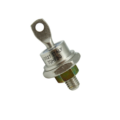 El diodo 70HF80 es un diodo rectificador de potencia de polaridad cátodo al tornillo y con características de avalancha. Cuenta con encapsulado tipo DO5 diseñado para su uso en aplicaciones de cargadores de baterías, convertidores, fuentes de alimentación y controles de maquinaria.