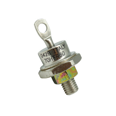 El 70HFR80 es un diodo rectificador de potencia con encapsulado tipo DO5 con polaridad de ánodo a tornillo y diseñado para su uso en aplicaciones de cargadores de baterías, convertidores, fuentes de alimentación y controles de maquinaria.