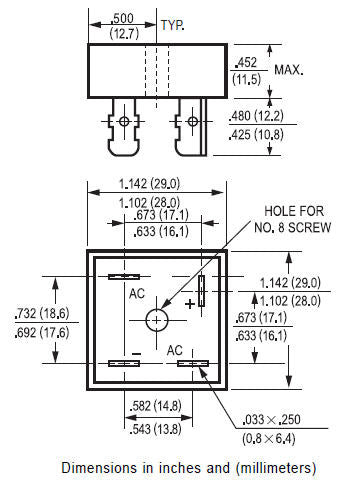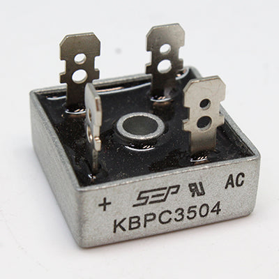 El KBPC3504 es un puente rectificador monofásico con juntura difusa y caja metálica con terminales faston chapadas, con orificio de montaje para tornillo número 10. El puente rectificador cuenta con caja de metal eléctricamente aislada para una máxima disipación de calor.