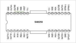 Circuito Integrado SA9258 para reproductores de CD, tiene un controlador BTL de 4 canales, un regulador de 5 V (se requiere un transistor PNP adjunto), un amplificador operacional estándar y una salida de reinicio interna vinculada a un circuito de apagado térmico interno. El controlador tiene pines de entrada de ajuste de ganancia para cada canal, lo que permite establecer la ganancia en el valor deseado. Además, el circuito de cambio de nivel interno ayuda a reducir la cantidad de componentes conectados.