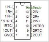 Circuito integrado SN75182. Dos receptores lineales diferenciales diseñado para detectar señales diferenciales pequeñas en presencia de ruido de modo común grande. Estos dispositivos dan señales de salida compatible TTL como una función de la polaridad de la tensión de entrada diferencial. La respuesta de frecuencia de cada canal puede ser fácilmente controlado por un único condensador exterior para proporcionar inmunidad diferencial picos de ruido. La salida va a un nivel alto cuando las entradas están en circuito abierto. Se proporciona una entrada de impulsos (strb) que, cuando está en el nivel bajo, se desactiva el receptor y fuerza la salida a un alto nivel.