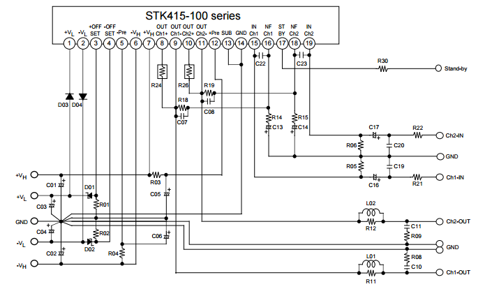 Circuito Integrado STK415-130LF es un amplificador de potencia de audio de dos canales de 100 + 100 W.