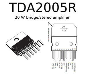 El TDA2005R es un amplificador de potencia de audio dual de clase B diseñado específicamente para aplicación de radio de coche: amplificadores de potencia son fácilmente diseñados con este dispositivo que proporciona una alta capacidad de corriente (hasta 3.5 A) y que puede con cargas de impedancia muy baja (hasta 1.6Ω).