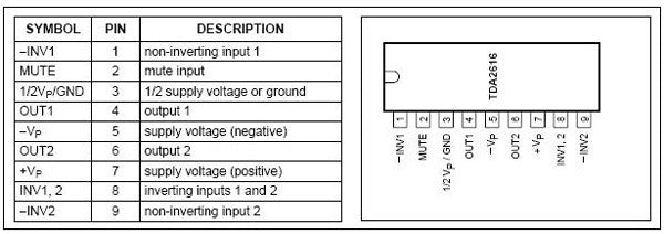 El TDA2616 y el TDA2616Q son amplificadores de potencia duales. El TDA2616 se suministra en un paquete de alimentación de plástico (SOT131) de una sola línea (SIL9) de 9 derivaciones, mientras que el TDA2616Q se suministra en un plástico de 9 derivaciones SIL-doblado a DIL paquete de energía (SOT157). Han sido especialmente diseñados para aplicaciones con alimentación de red, como radio estéreo y TV estéreo.