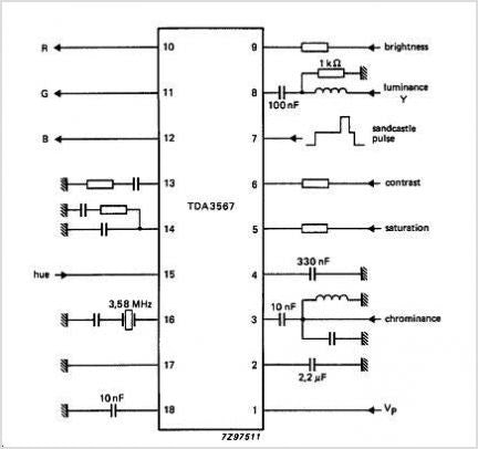 l TDA3567 es un decodificador integrado monolítico para los estándares de televisión en color NTSC. Combina todas las funciones necesarias para la demodulación de señales NTSC. Además, contiene un amplificador de luminancia, una matriz RGB y un amplificador. Estos amplificadores suministran señales de salida de hasta 5 V pico a pico (información de imagen), lo que permite la activación directa de las etapas de salida discretas.