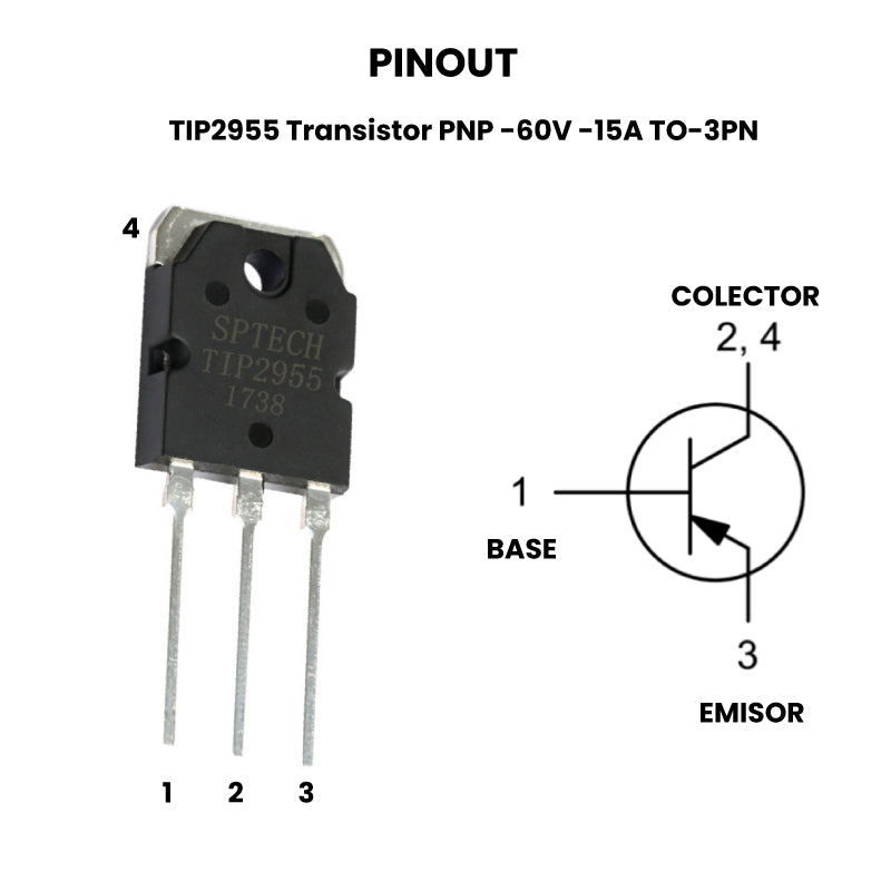 El TIP2955 es un transistor de potencia PNP bipolar de alta potencia diseñados para manejar una corriente continua de -15A y voltaje colector-emisor -60V. Estos transistores se utilizan en una variedad de aplicaciones, como amplificadores de potencia, reguladores de voltaje, inversores, fuentes de alimentación conmutadas y otros circuitos de control de potencia. El transistor TIP2955 tiene como complemento al TIP3055 el cual es un transistor NPN que se puede usar en aplicaciones donde se necesite un par complementario NPN-PNP para diseño de etapas de salida, entre otras aplicaciones.