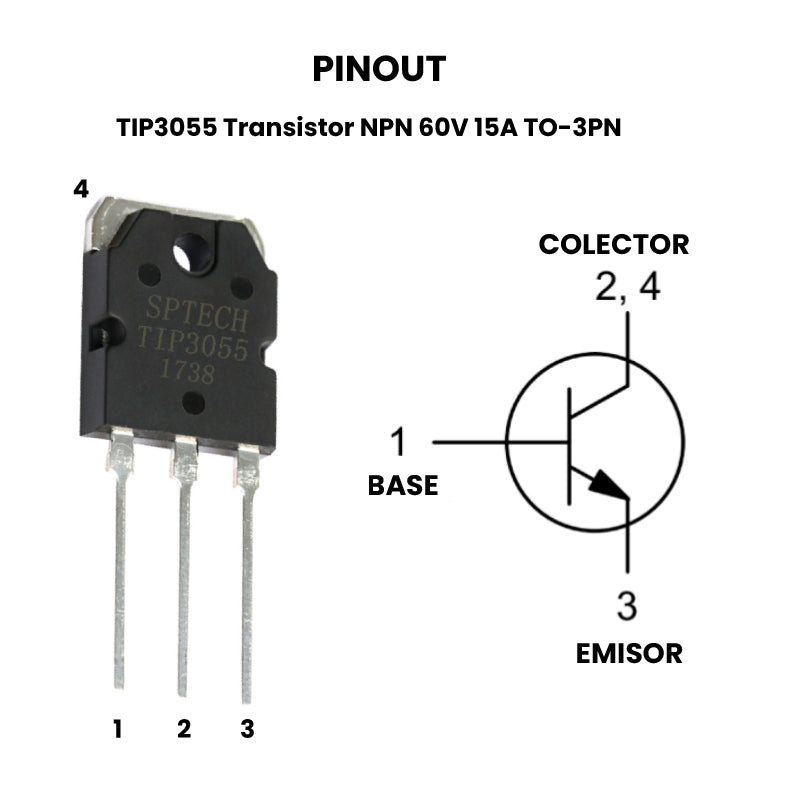 El TIP3055 es un ransistor NPN es un transistor de potencia de silicio, puede manejar una corriente continua de 15A y un voltaje de 60V colector-emisor, lo que lo hace útil en una amplia gama de aplicaciones donde se requiere control de potencia. Su diseño robusto y su capacidad para disipar el calor gracias a su encapsulado TO-3PN lo hace adecuado para aplicaciones que requieren alta potencia y fiabilidad. El transistor TIP3055 tiene como complemento al TIP2955 el cual es un transistor PNP que se puede usar en aplicaciones donde se necesite un par complementario NPN-PNP para diseño de etapas de salida, entre otras aplicaciones.